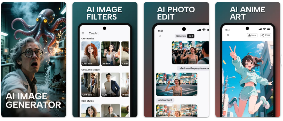 지금부터 무료 이미지 생성 ai 어플을 소개해 드리겠습니다. CreArt는 스마트폰에서 텍스트만 입력해도 독창적인 그림을 만들어주는 AI 이미지 생성 및 편집 도구입니다. 이 앱은 단순히 사진을 보정하는 기능뿐 아니라 상상하는 아이디어를 생생한 이미지로 변환해 주는 창작 도구로 설계되어 있습니다. 수많은 예술 스타일을 선택할 수 있고, 사진 편집 기능을 함께 제공해 크리에이터부터 일반 사용자까지 폭넓게 활용할 수 있는 것이 특징입니다.